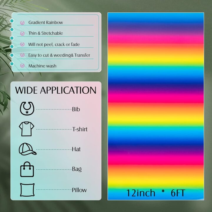 - Colorful Brilliance: Immerse your projects in a spectrum of colors with Rainbow Vinyl Heat Transfer Vinyl. The vibrant hues add a lively and dynamic element to your designs.